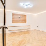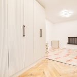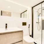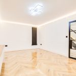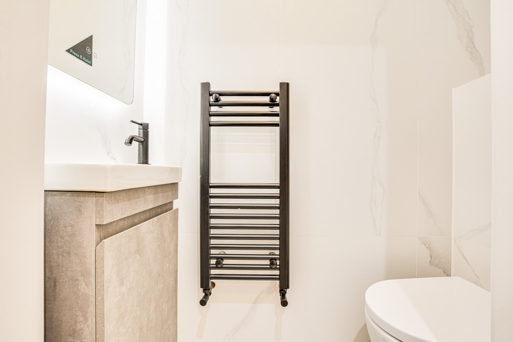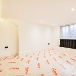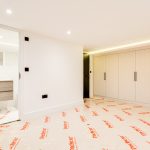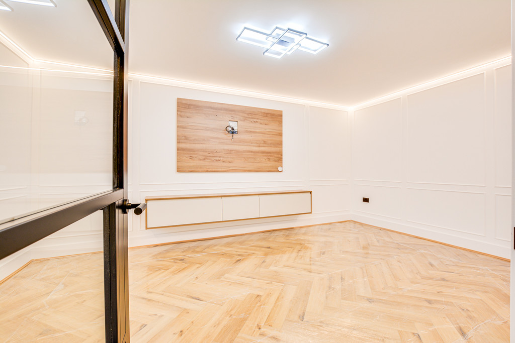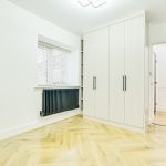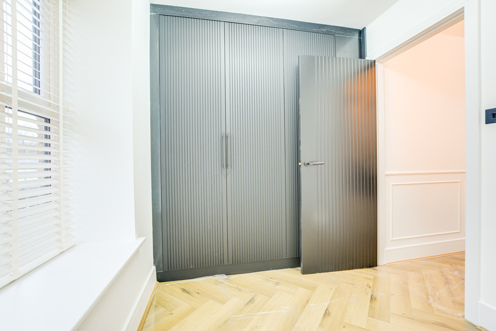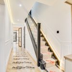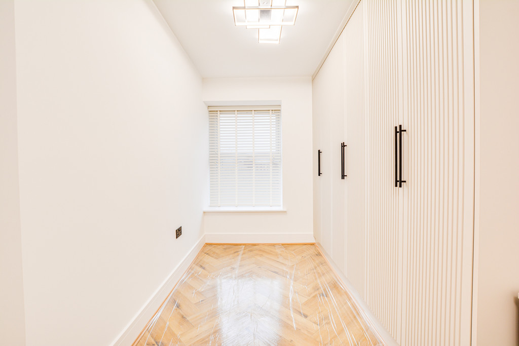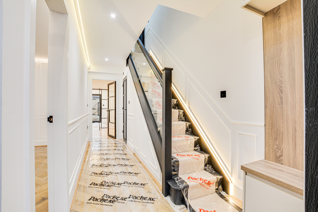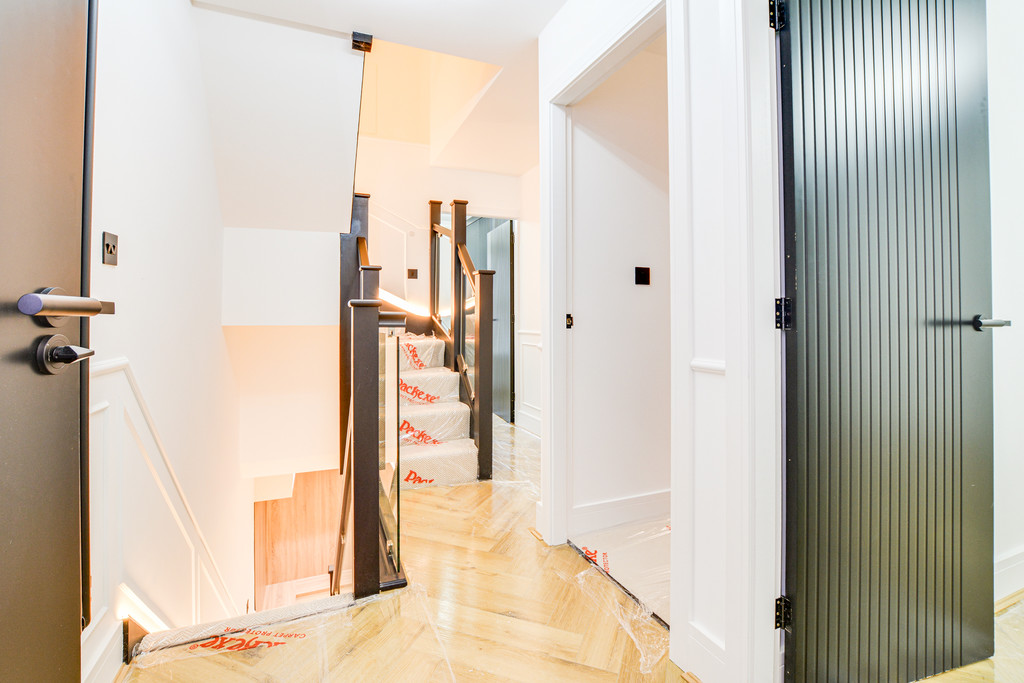 The staircase, finished with glass balustrades and a herringbone runner, leads to three well-proportioned bedrooms and a contemporary family bathroom fitted with Italian porcelain tiles. Each bedroom features plush carpeting and bespoke ribbed wardrobes with motion-sensor LED lighting.