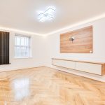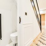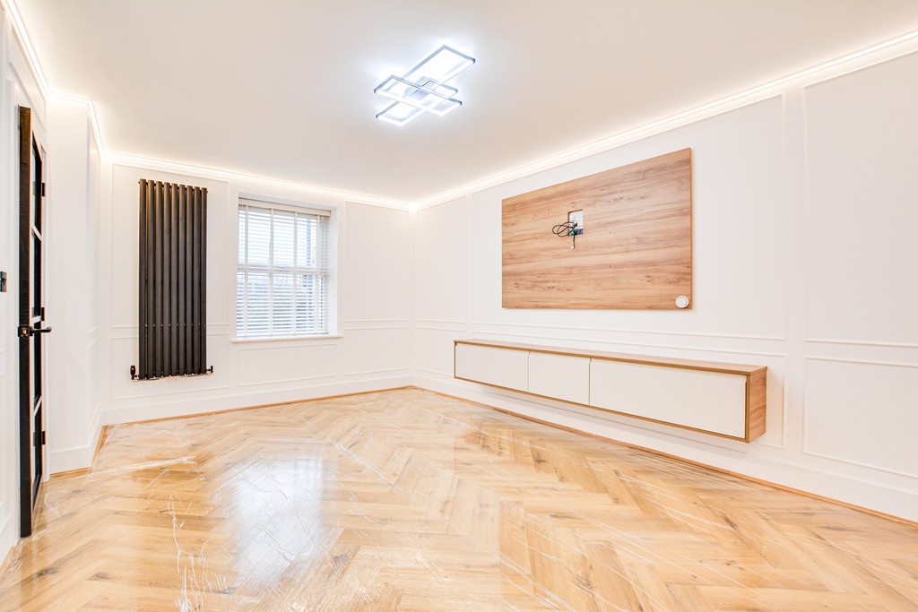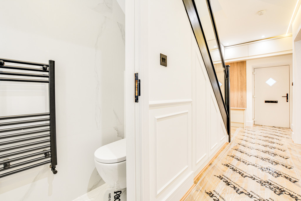 The welcoming entrance hallway features bespoke under-stair storage illuminated by LED lighting, alongside a beautifully finished downstairs WC. The spacious living room continues the home's refined aesthetic, complete with elegant wall panelling and a striking media wall with integrated lighting.