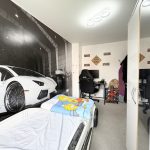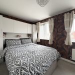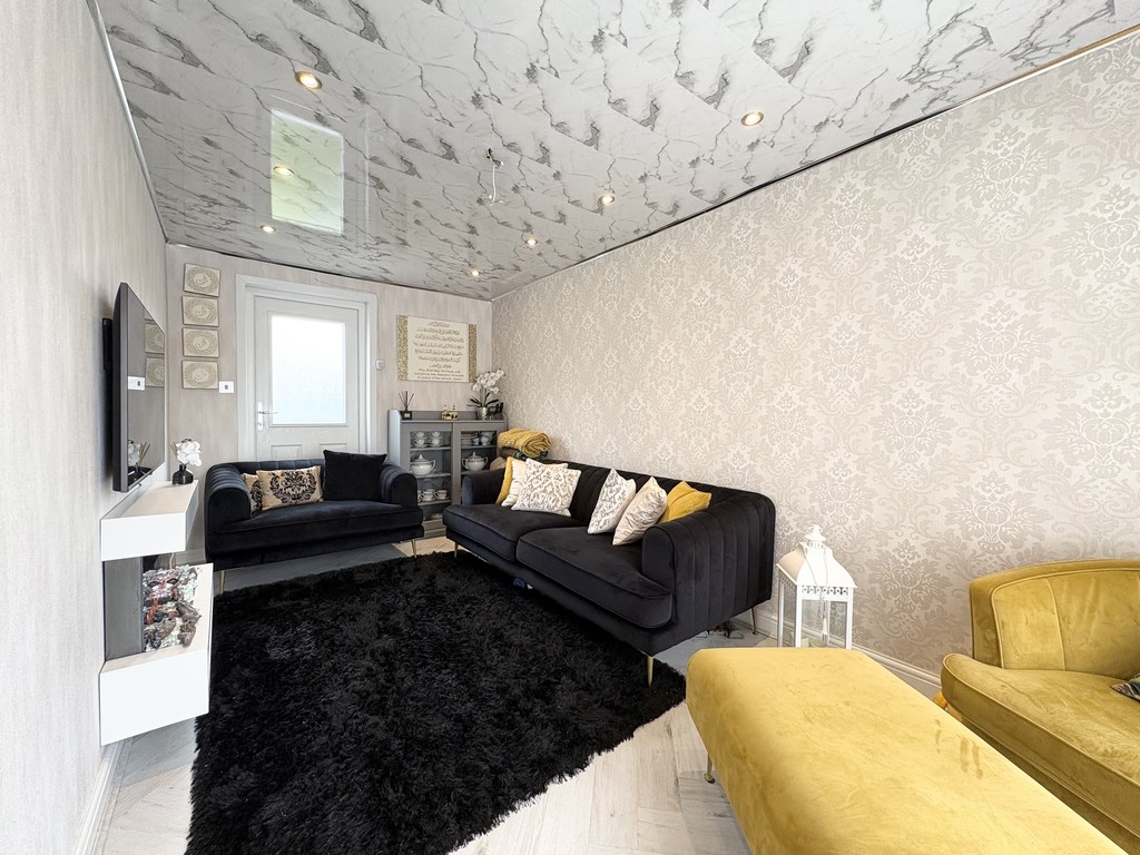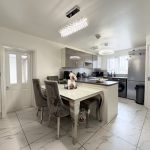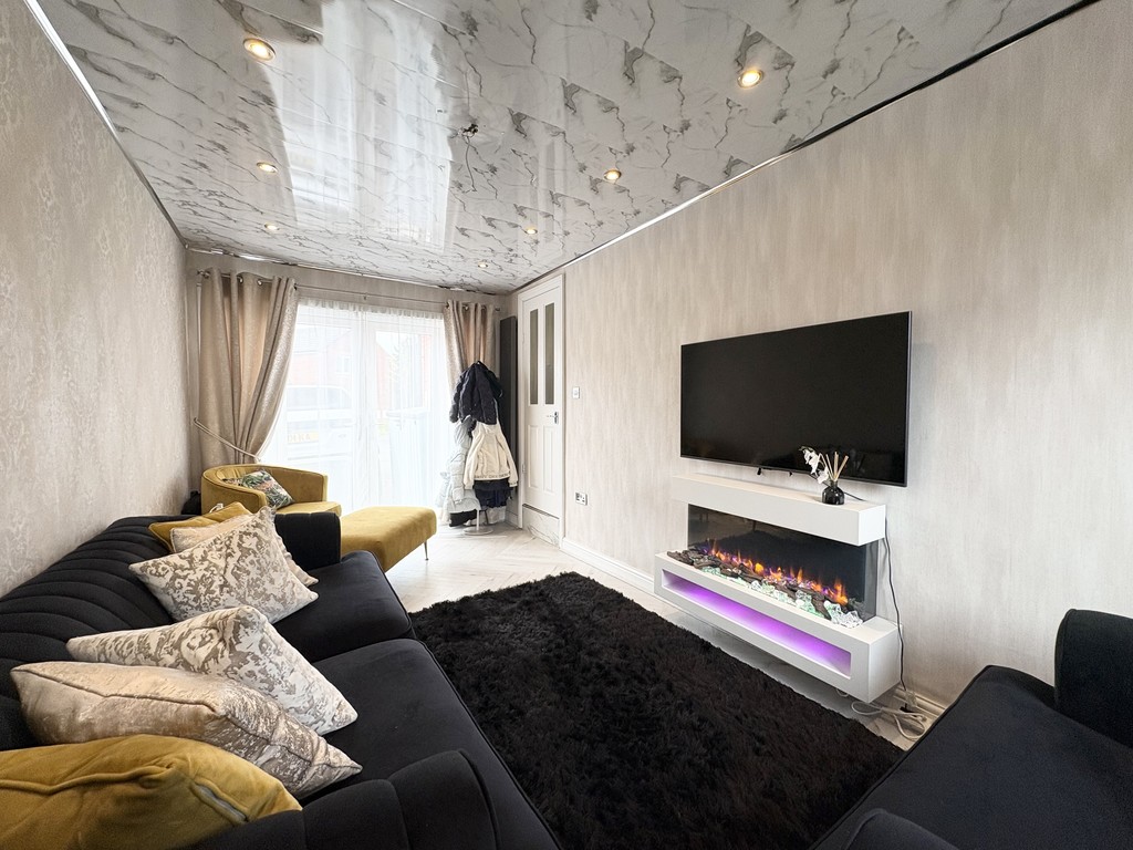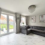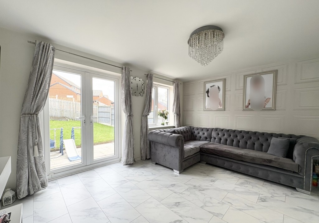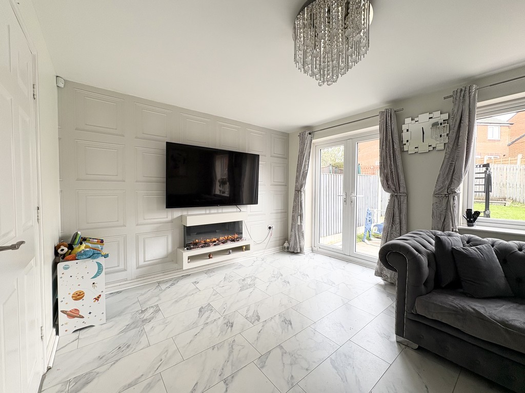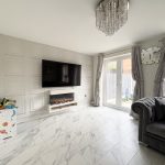 The lounge is a beautifully presented and generously sized living area, designed to be both comfortable and visually striking. Continuing the elegant marble-effect flooring, the room is further enhanced by stylish wall panelling that adds texture and character. A modern electric fireplace serves as a focal point, creating a warm and inviting atmosphere, ideal for relaxing evenings. Large double doors open out onto the rear garden, allowing natural light to flood the space while also providing easy access for indoor-outdoor living during the warmer months.