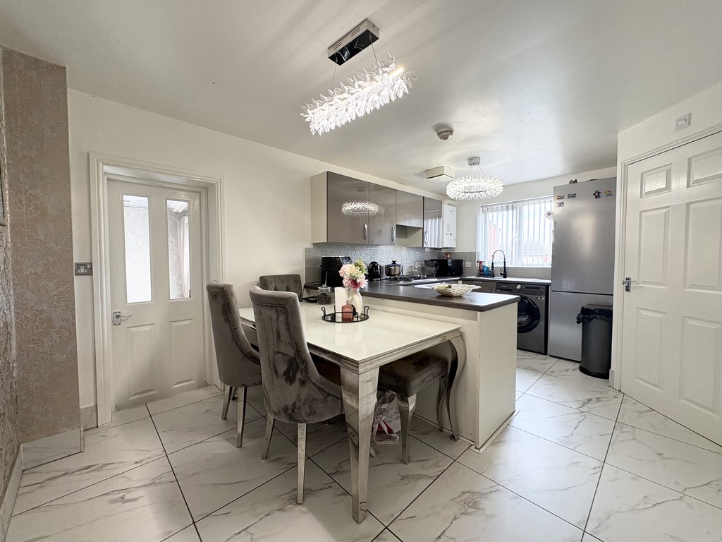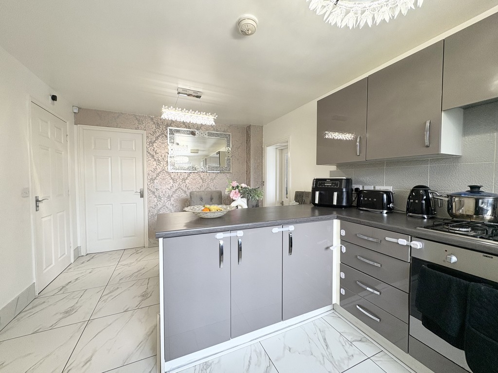 Upon entering the property, you are greeted by a welcoming entrance hallway, thoughtfully laid out with staircase access to the first floor and internal access leading into the main living areas. From here, you step into the impressive open-plan kitchen and dining space, which truly forms the heart of the home. This stunning area has been designed with both style and functionality in mind, featuring high-quality marble-effect tiled flooring that creates a sleek, luxurious feel while remaining practical for everyday use. The kitchen itself is fitted with a range of modern grey gloss wall and base units, offering ample storage and a clean, contemporary finish. Integrated appliances, including a fitted oven and gas hob, are perfectly positioned to maximise usability, making this space ideal for both day-to-day living and entertaining.