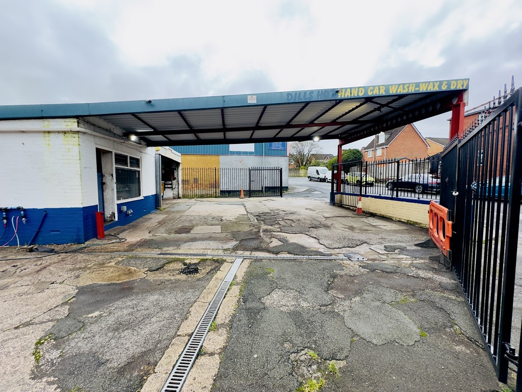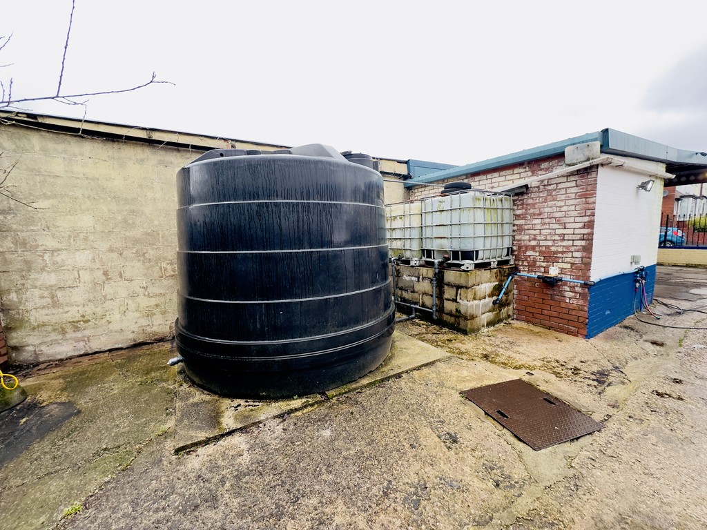 Externally, the premises benefits from a large enclosed forecourt with secure gated access, providing ample space for vehicle storage, customer parking, and operational movement. The yard is finished in durable hardstanding suitable for commercial vehicle use and offers excellent accessibility. A dedicated covered car wash bay is positioned within the yard, allowing for all-weather operation. This area is equipped with exterior lighting and outdoor plug sockets, ensuring practicality and convenience for detailing or valeting services. The car wash area also features integrated grid drainage for effective water run-off management. A significant cost-saving feature of the property is the large rainwater harvesting tank system, which collects and filters rainwater for reuse in vehicle washing, helping to reduce ongoing water expenses while promoting environmental efficiency.