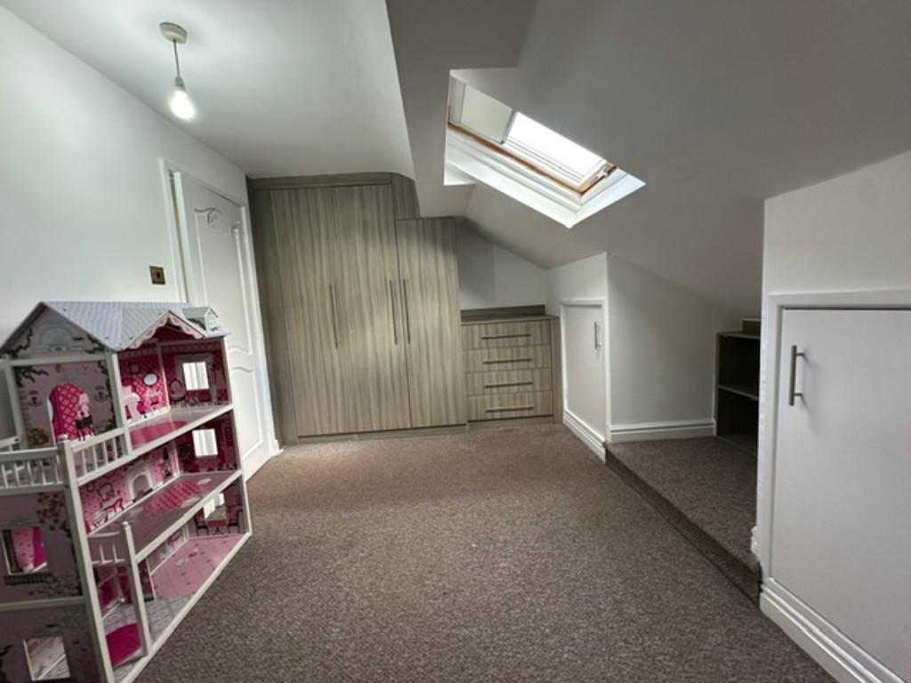 To the first floor, the landing gives access to two spacious bedrooms, both featuring fitted wardrobes, along with a family bathroom complete with a corner bath suite. The second floor comprises two further bedrooms, offering flexibility for use as additional bedrooms, home office, or study space.