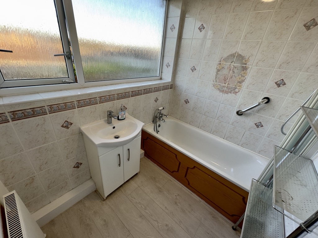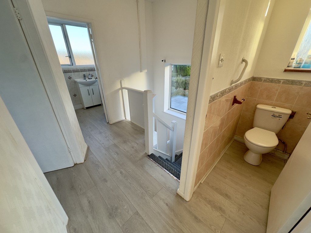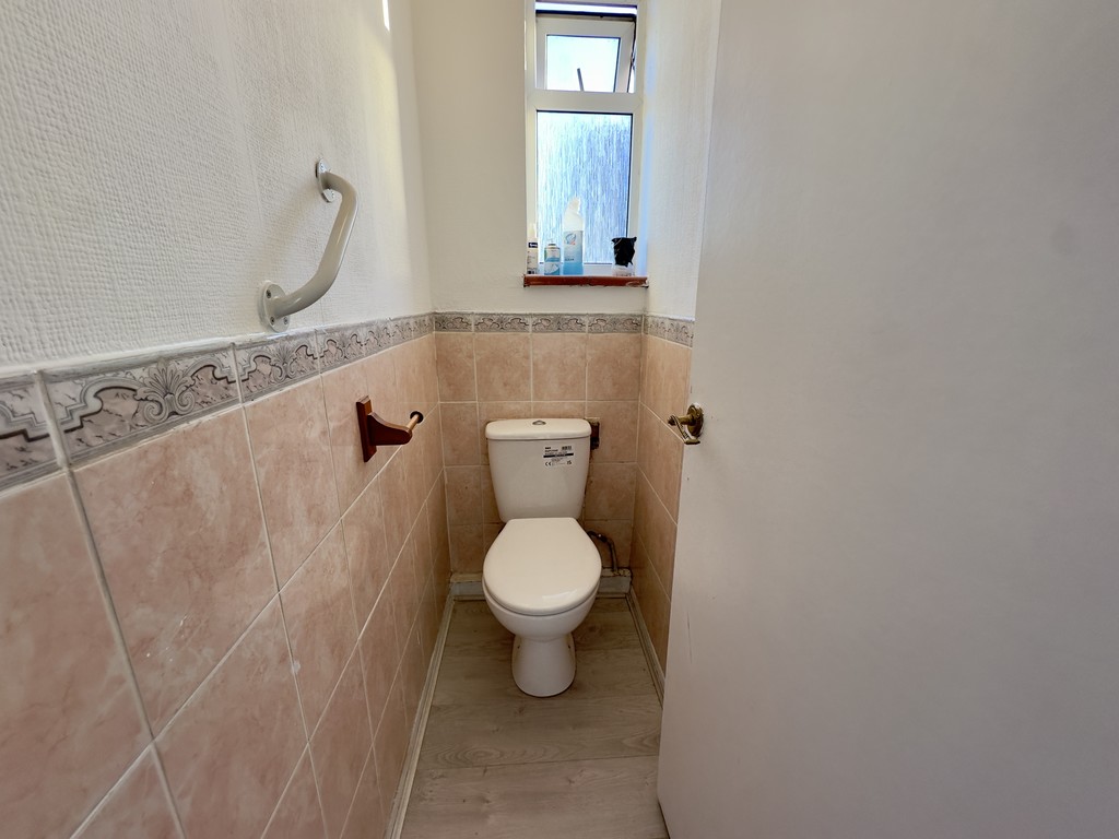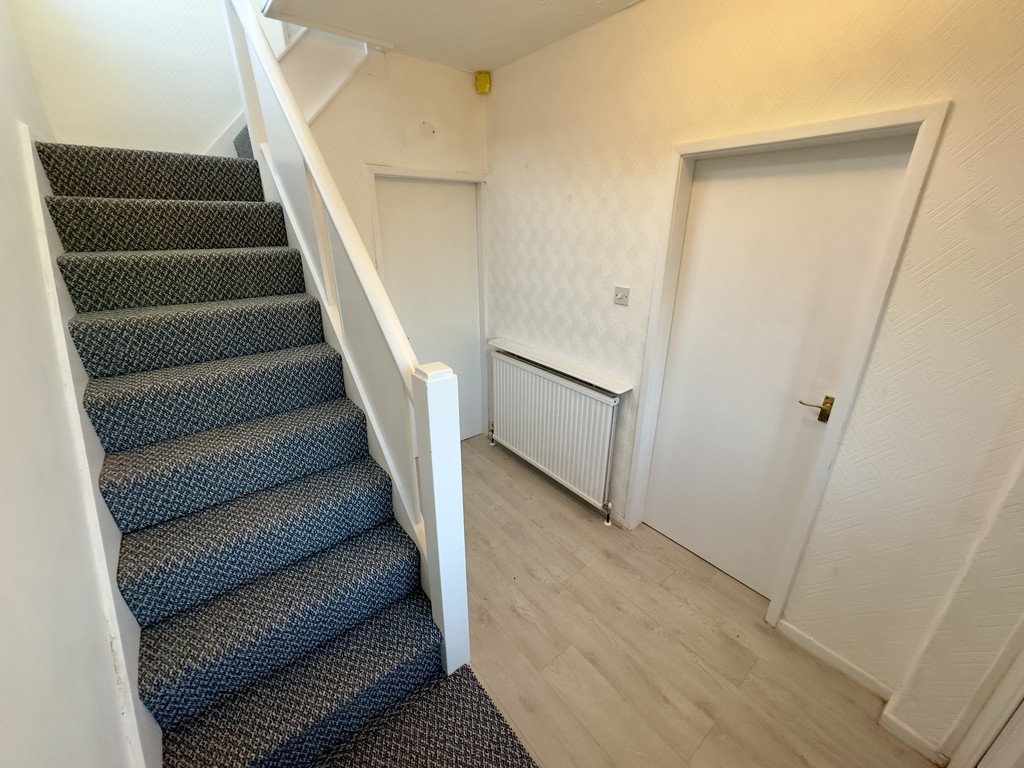 To the first floor, the landing leads to three well-proportioned bedrooms. The property includes a two-piece bathroom suite and a separate WC. Laminate flooring runs throughout the ground floor and all bedrooms, while the landing is carpeted for comfort. Additional benefits include double-glazed windows, gas central heating and a lawned garden to the rear, ideal for families.