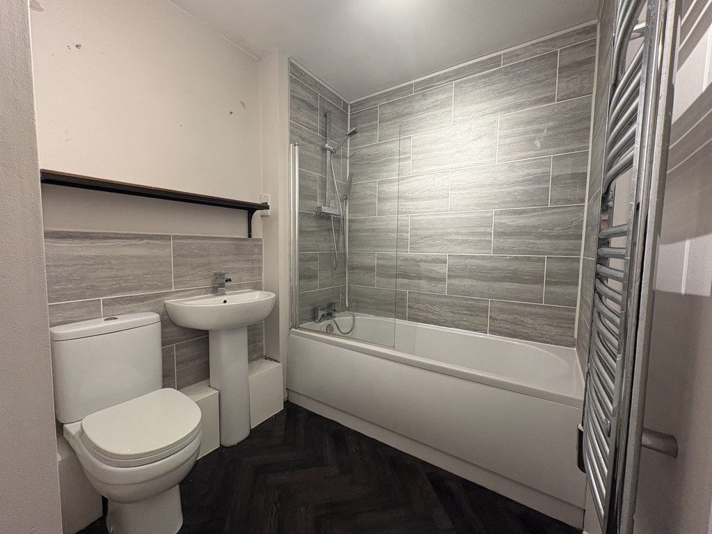 The contemporary bathroom has been finished to an excellent standard, featuring a full-sized bath with overhead shower, sleek modern fittings, and a stylish wall-mounted radiator-creating a clean, elegant space ideal for relaxing and unwinding.